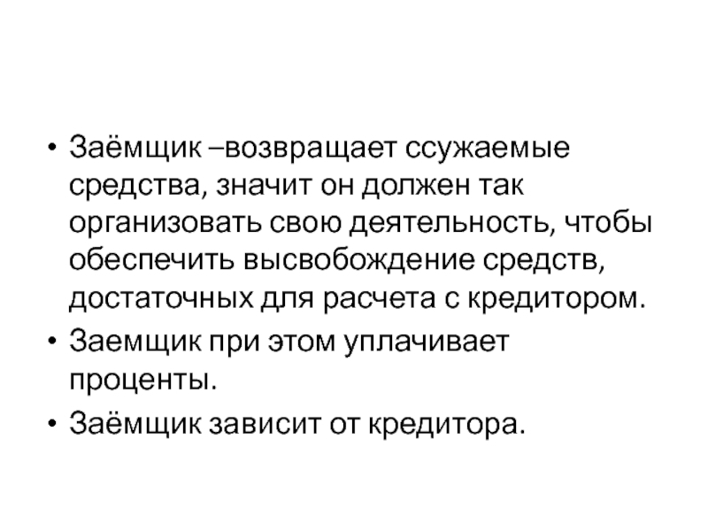 Слайд 11Заёмщик –возвращает ссужаемые средства, значит он должен так организовать свою