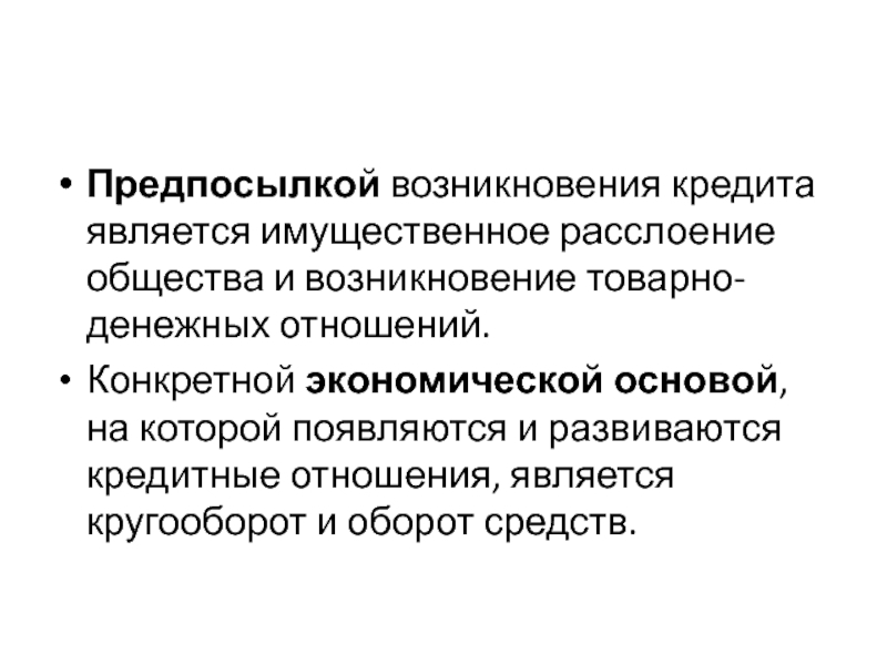 Слайд 3Предпосылкой возникновения кредита является имущественное расслоение общества и возникновение товарно-денежных