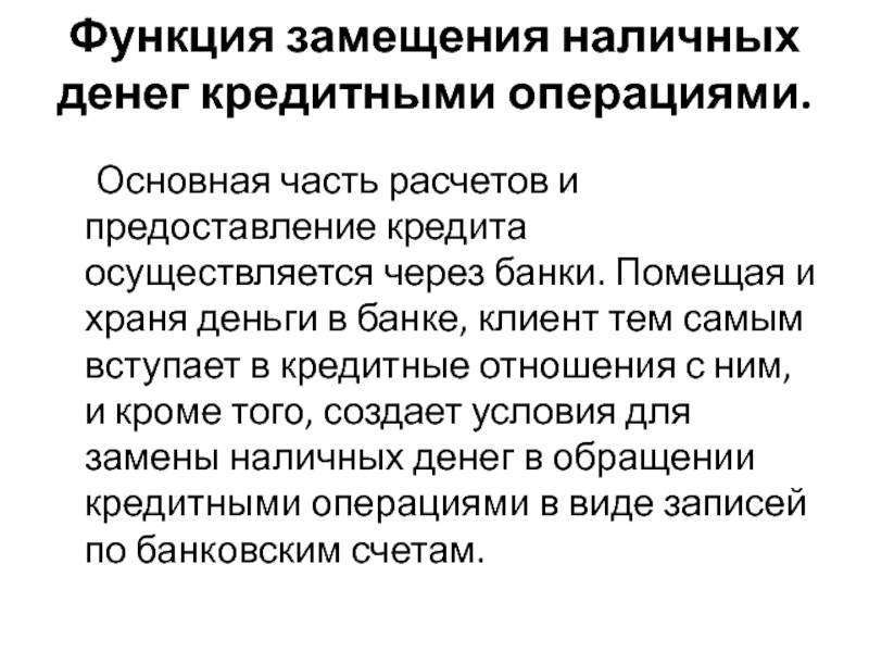Слайд 18Функция замещения наличных денег кредитными операциями.