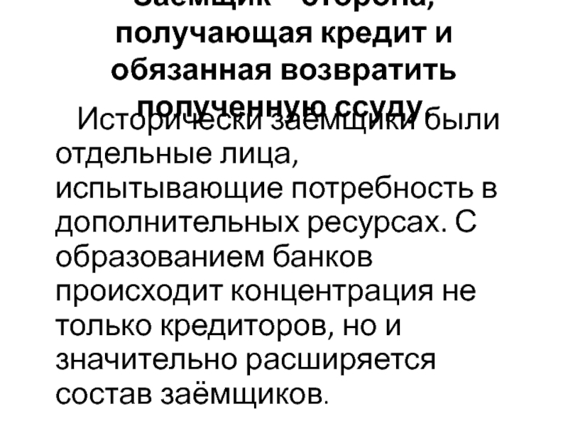 Слайд 9Заемщик – сторона, получающая кредит и обязанная возвратить полученную ссуду.