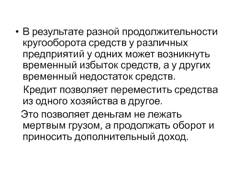 Кредит позволяет переместить средства из одного хозяйства в другое.