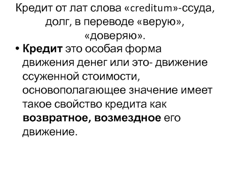 Слайд 2Кредит от лат слова «creditum»-ссуда, долг, в переводе «верую», «доверяю».