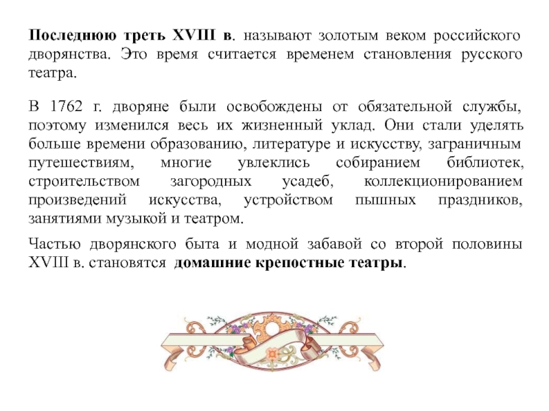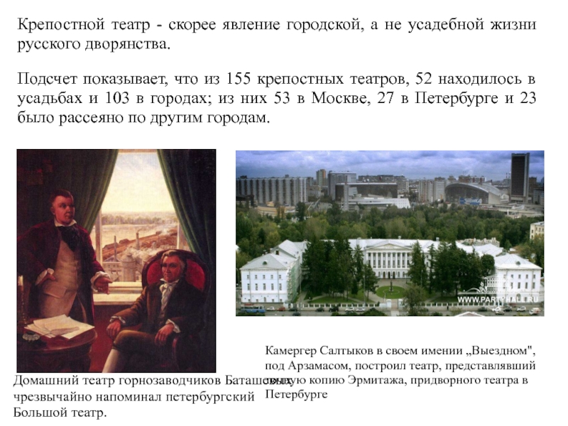 Слайд 3Крепостной театр - скорее явление городской, а не усадебной жизни