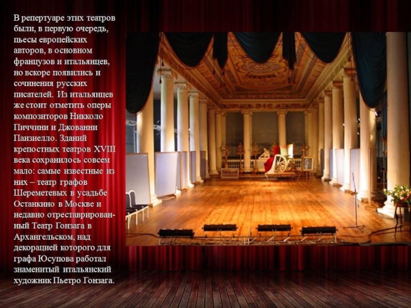 Слайд 17Останкинская сцена отвечала требованиям, сформулированным итальянским живописцем, театральным декоратором и