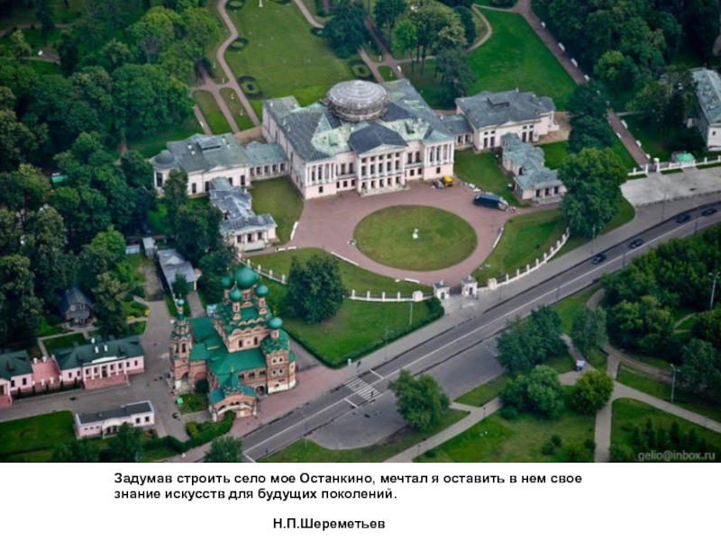 Слайд 14Задумав строить село мое Останкино, мечтал я оставить в нем