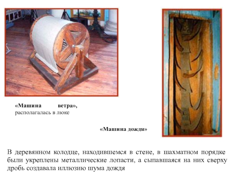 Слайд 21Над авансценой находилась машина грома, сконструированная из пустого ящика-резонатора и
