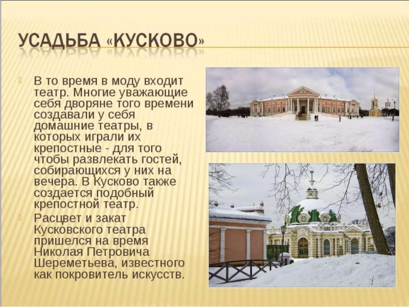 Слайд 4 Театры графа Шереметева в Останкино и Кусково, князя Юсупова