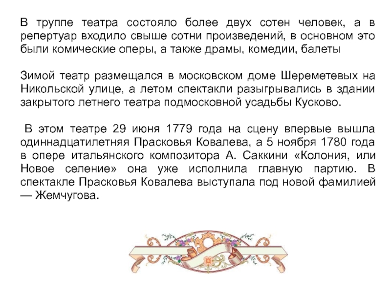 В этом театре 29 июня 1779 года на сцену впервые вышла одиннадцатилетняя Прасковья Ковалева, а 5 ноября 1780 года в опере итальянского композитора А. Саккини «Колония, или Новое селение» она уже исполнила главную партию. В спектакле Прасковья Ковалева выступала под новой фамилией — Жемчугова.