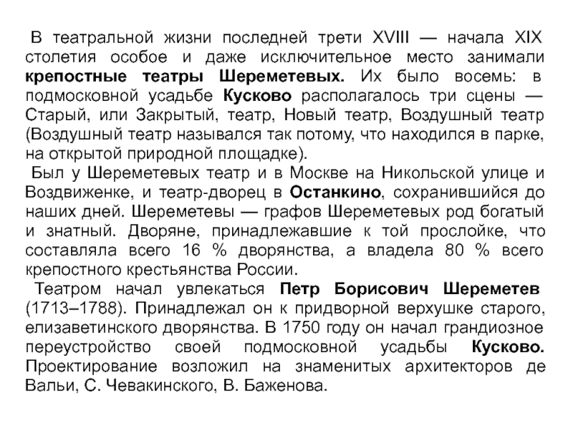 XVIII веке. Репертуар крепостного театра Шереметевых не уступал репертуару профессиональных