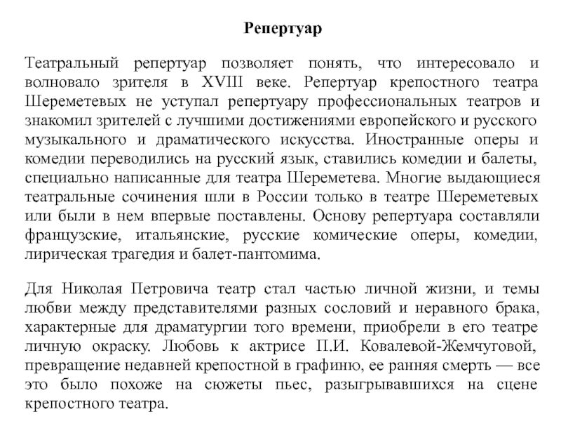 театров и знакомил зрителей с лучшими достижениями европейского и русского музыкального и драматического искусства. Иностранные оперы и комедии переводились на русский язык, ставились комедии и балеты, специально написанные для театра Шереметева. Многие выдающиеся театральные сочинения шли в России только в театре Шереметевых или были в нем впервые поставлены. Основу репертуара составляли французские, итальянские, русские комические оперы, комедии, лирическая трагедия и балет-пантомима.