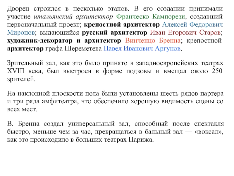 Федорович Миронов; выдающийся русский архитектор Иван Егорович Старов; художник-декоратор и архитектор Винченцо Бренна; крепостной архитектор графа Шереметева Павел Иванович Аргунов.