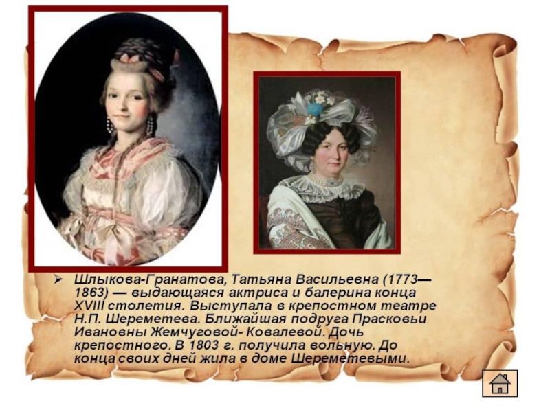 Прасковья Ивановна Ковалева-Жемчугова, талантливая актриса и певица, прекрасно воспитанная, образованная, умная и обаятельная девушка, была взята в дом Шереметевых семилетней девочкой и стала ведущей актрисой театра Шереметева.