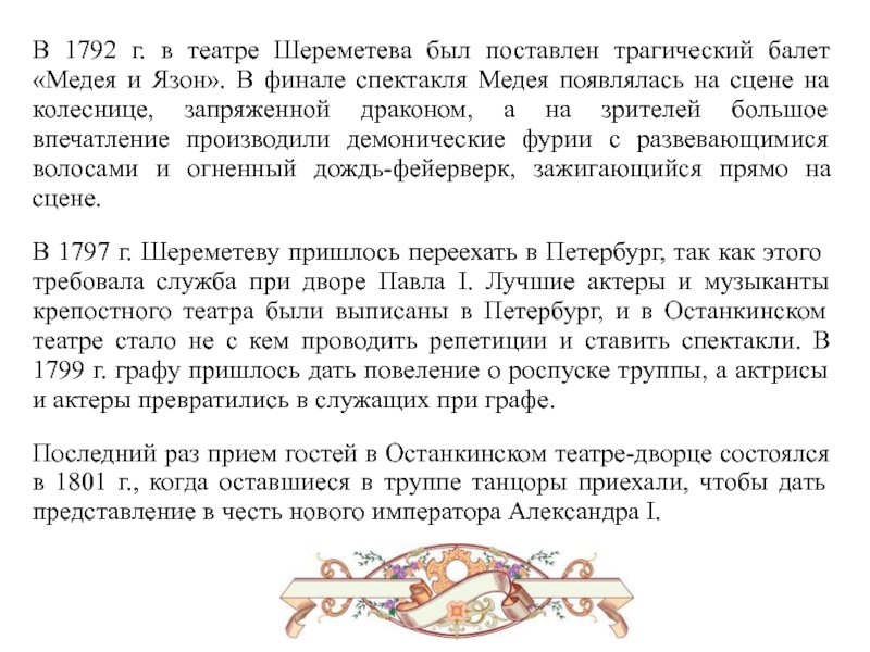Слайд 31В 1792 г. в театре Шереметева был поставлен трагический балет
