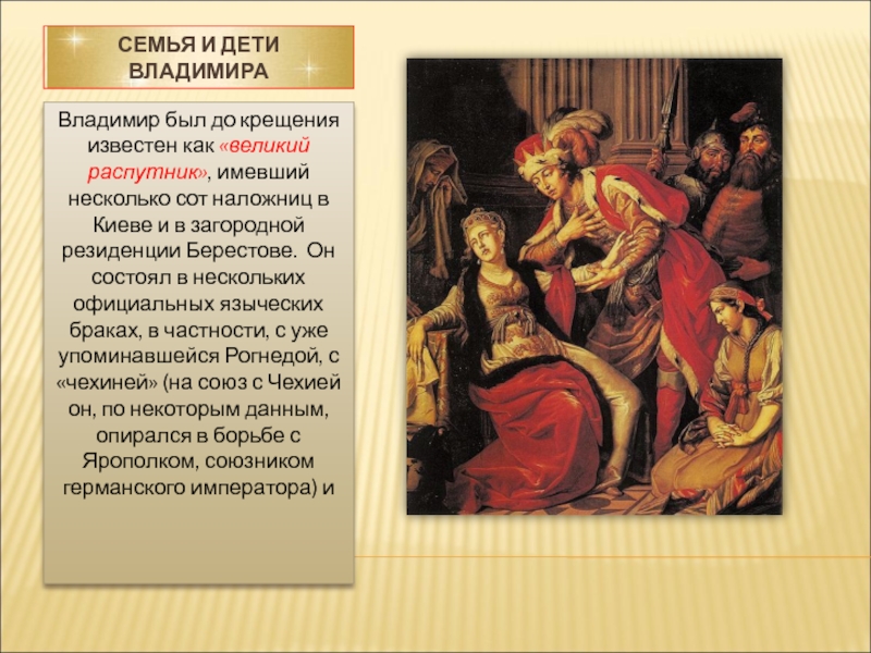 загородной резиденции Берестове. Он состоял в нескольких официальных языческих браках, в частности, с уже упоминавшейся Рогнедой, с «чехиней» (на союз с Чехией он, по некоторым данным, опирался в борьбе с Ярополком, союзником германского императора) и