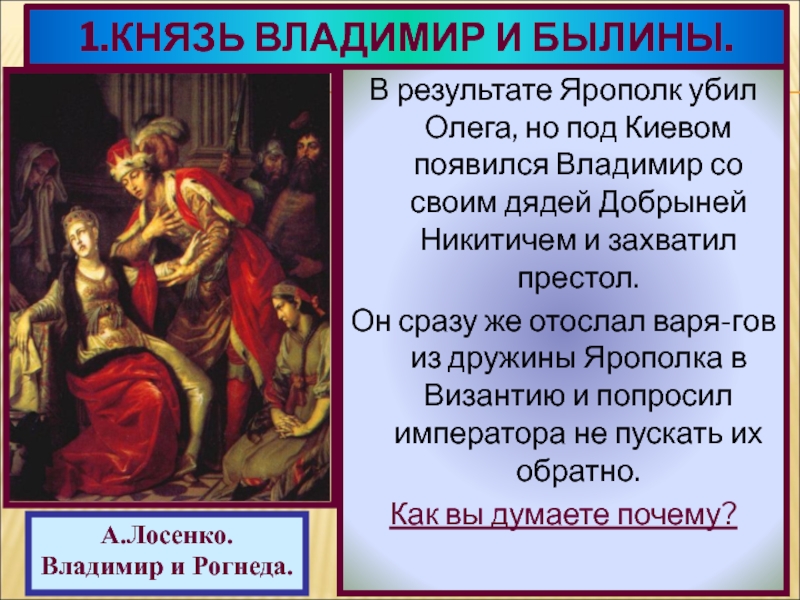 Он сразу же отослал варя-гов из дружины Ярополка в Византию и попросил императора не пускать их обратно.