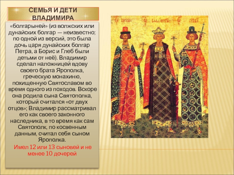 дунайских болгар Петра, а Борис и Глеб были детьми от неё). Владимир сделал наложницей вдову своего брата Ярополка, греческую монахиню, похищенную Святославом во время одного из походов. Вскоре она родила сына Святополка, который считался «от двух отцов»; Владимир рассматривал его как своего законного наследника, в то время как сам Святополк, по косвенным данным, считал себя сыном Ярополка.