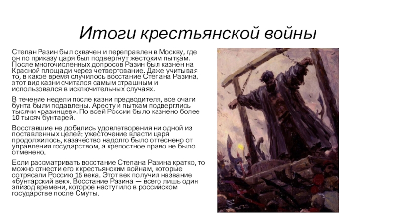 многочисленных допросов Разин был казнён на Красной площади через четвертование. Даже учитывая то, в какое время случилось восстание Степана Разина, этот вид казни считался самым страшным и использовался в исключительных случаях.
