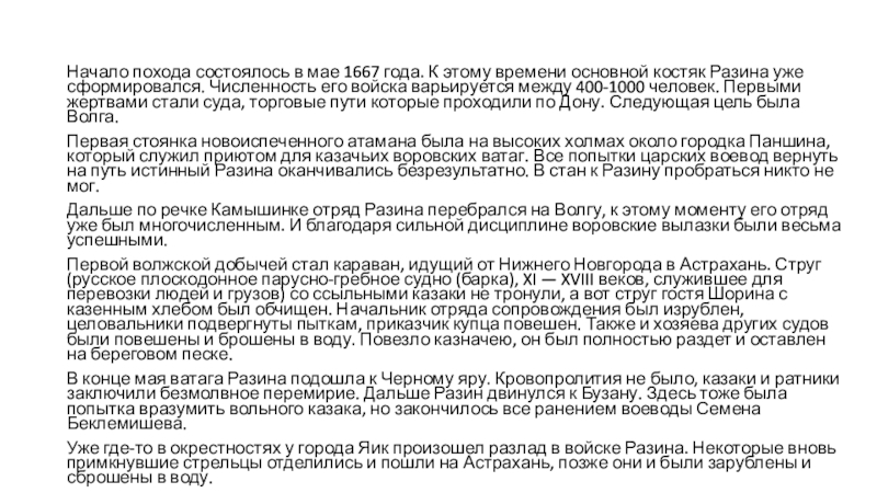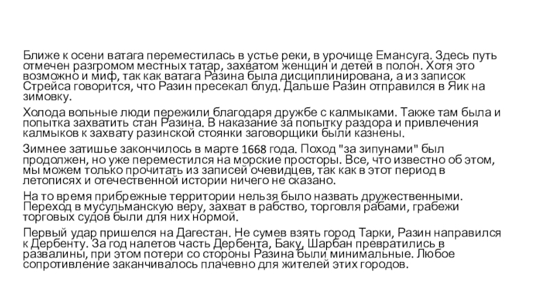 детей в полон. Хотя это возможно и миф, так как ватага Разина была дисциплинирована, а из записок Стрейса говорится, что Разин пресекал блуд. Дальше Разин отправился в Яик на зимовку.