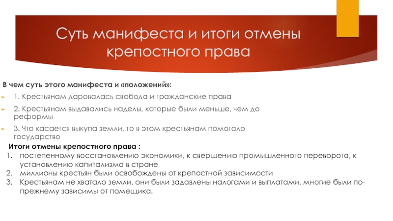 Крестьянам не хватало земли, они были задавлены налогами и выплатами, многие были по-прежнему зависимы от помещика.