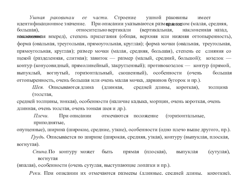 круглая); форма мочки (овальная, треугольная, прямоугольная, круглая); размер мочки (малая, средняя, большая), степень ее слияния со щекой (разделенная, слитная); завиток — размер (малый, средний, большой); козелок — контур (конусовидный, прямолинейный, закругленный); противокозелок — контур (прямой, выпуклый, вогнутый, горизонтальный, скошенный), особенности (очень большая оттопыренность, очень большая или очень малая мочка, дарвинов бугорок и пр.).