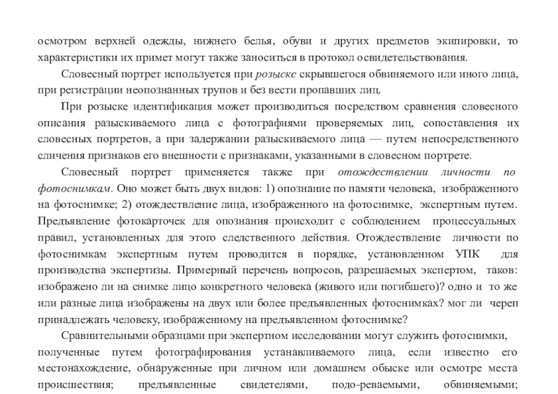 освидетельствование обвиняемого, подозреваемого, свидетеля или потерпевшего для уста-новления наличия особых примет на их теле. Описание их должно производиться на основе правил составления словесного портрета. Если освидетельствование сопровождается