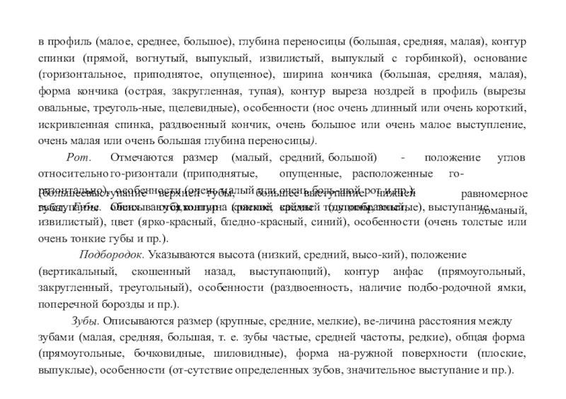 Слайд 8в профиль (малое, среднее, большое), глубина переносицы (большая, средняя, малая),