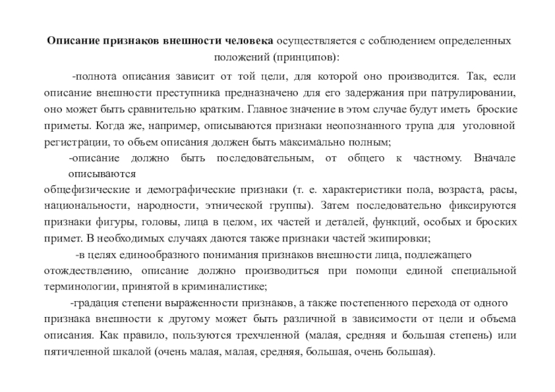 если описание внешности преступника предназначено для его задержания при патрулировании, оно может быть сравнительно кратким. Главное значение в этом случае будут иметь броские приметы. Когда же, например, описываются признаки неопознанного трупа для уголовной регистрации, то объем описания должен быть максимально полным;