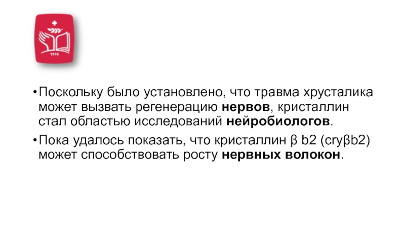 Слайд 10Поскольку было установлено, что травма хрусталика может вызвать регенерацию нервов,
