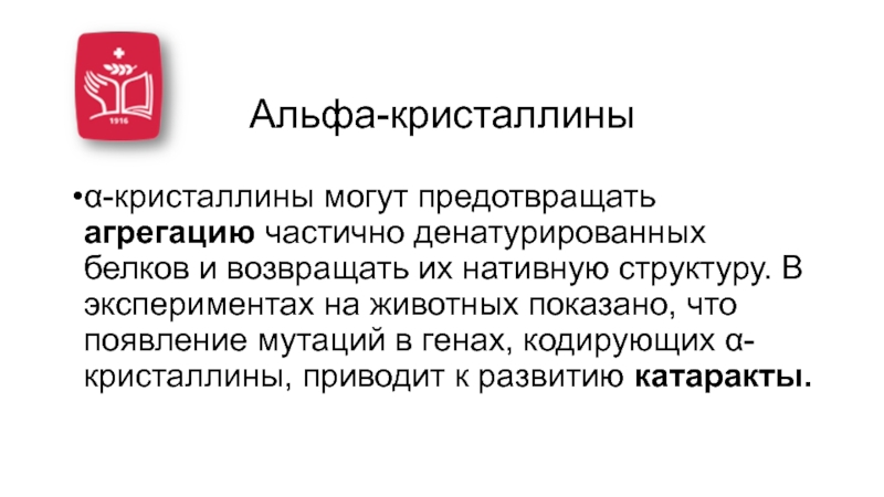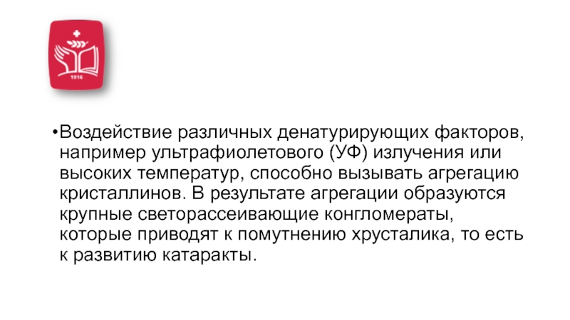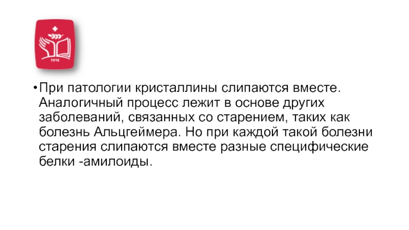 Слайд 9При патологии кристаллины слипаются вместе. Аналогичный процесс лежит в основе