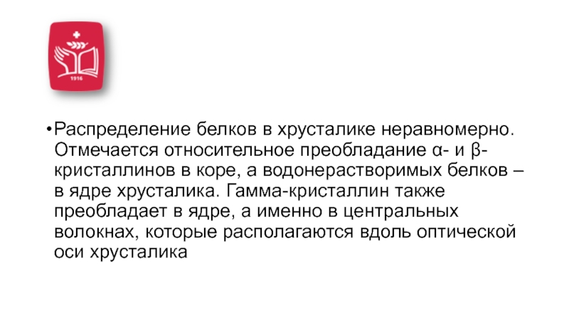 Слайд 21Распределение белков в хрусталике неравномерно. Отмечается относительное преобладание α- и