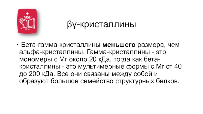 Бета-гамма-кристаллины меньшего размера, чем альфа-кристаллины. Гамма-кристаллины - это мономеры
