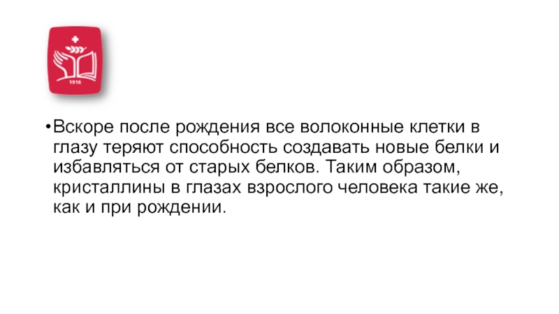 Слайд 6Вскоре после рождения все волоконные клетки в глазу теряют способность