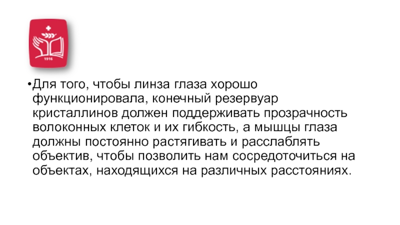 Слайд 7Для того, чтобы линза глаза хорошо функционировала, конечный резервуар кристаллинов