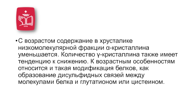 Слайд 22С возрастом содержание в хрусталике низкомолекулярной фракции α-кристаллина уменьшается. Количество