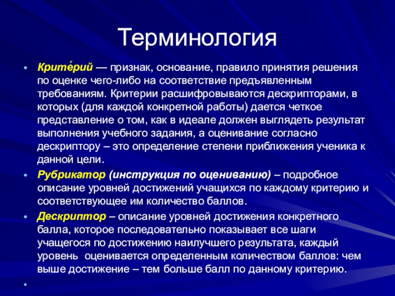 на соответствие предъявленным требованиям. Критерии расшифровываются дескрипторами, в которых (для