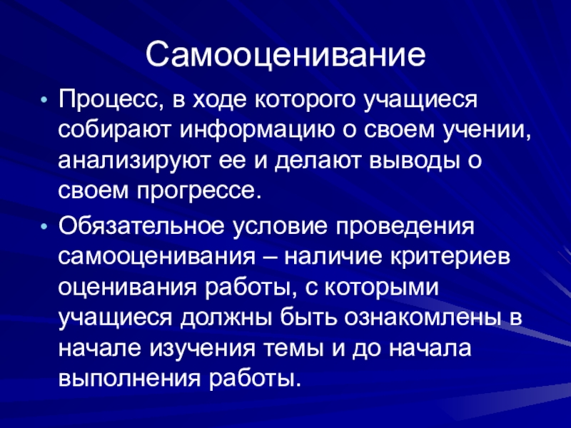 проведения самооценивания – наличие критериев оценивания работы, с которыми учащиеся должны быть ознакомлены в начале изучения темы и до начала выполнения работы.
