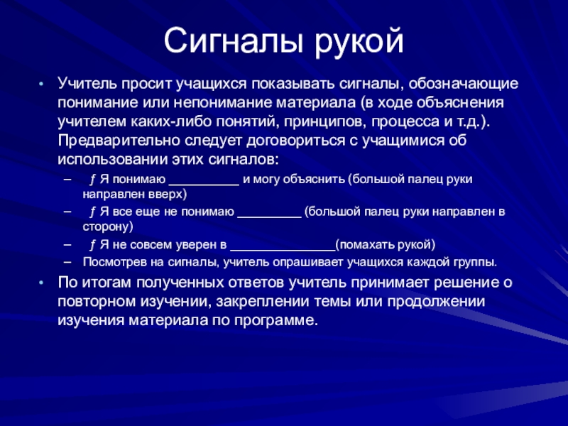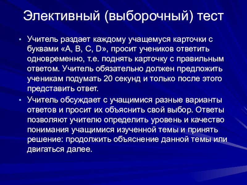 Учитель обсуждает с учащимися разные варианты ответов и просит их объяснить свой выбор. Ответы позволяют учителю определить уровень и качество понимания учащимися изученной темы и принять решение: продолжить объяснение данной темы или двигаться далее.
