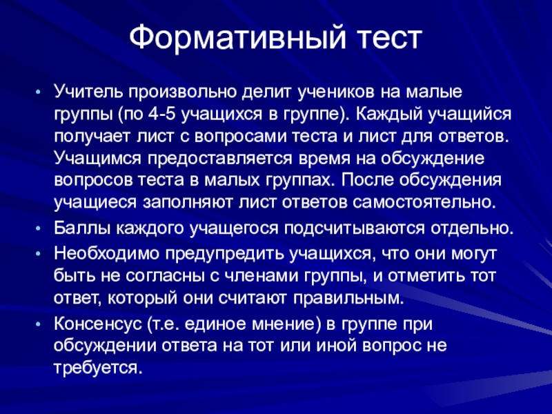 и лист для ответов. Учащимся предоставляется время на обсуждение вопросов теста в малых группах. После обсуждения учащиеся заполняют лист ответов самостоятельно.