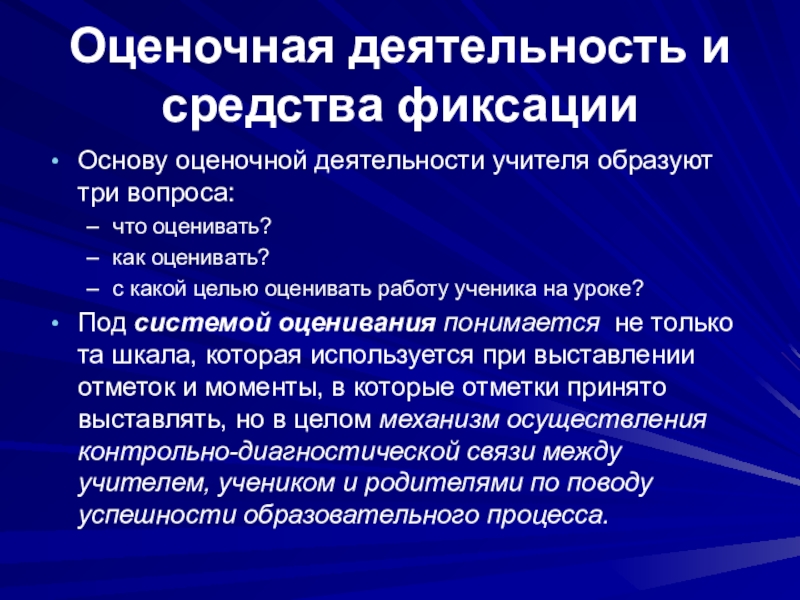 оценивания понимается не только та шкала, которая используется при выставлении отметок и моменты, в которые отметки принято выставлять, но в целом механизм осуществления контрольно-диагностической связи между учителем, учеником и родителями по поводу успешности образовательного процесса.