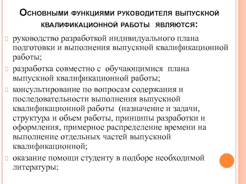 Слайд 29Основными функциями руководителя выпускной квалификационной работы являются: