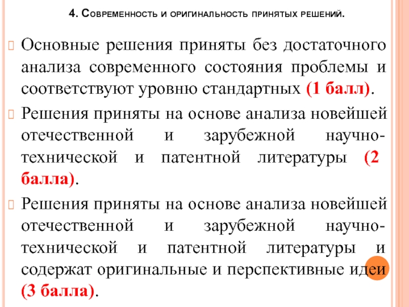 Решения приняты на основе анализа новейшей отечественной и зарубежной научно-технической и патентной литературы и содержат оригинальные и перспективные идеи (3 балла).