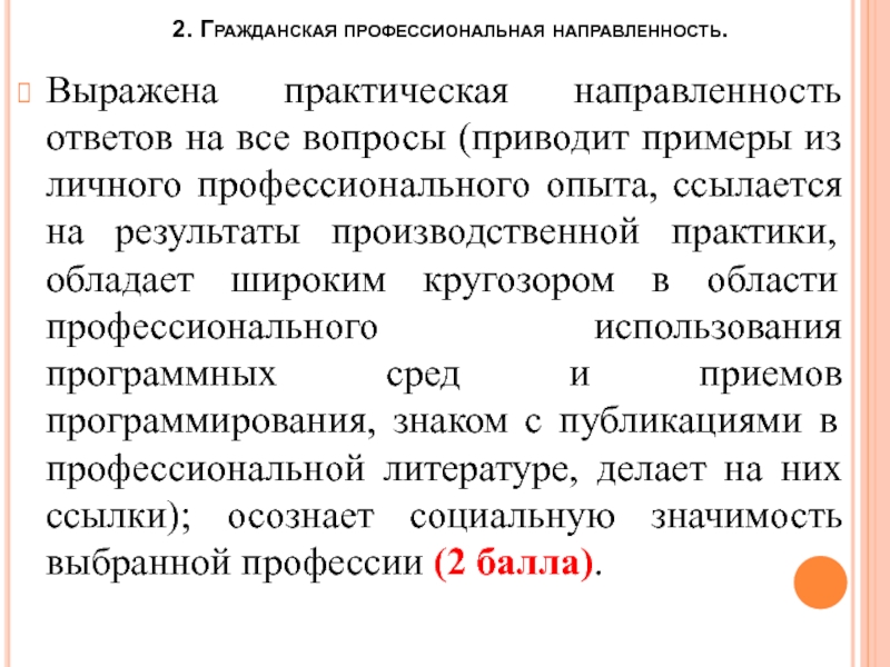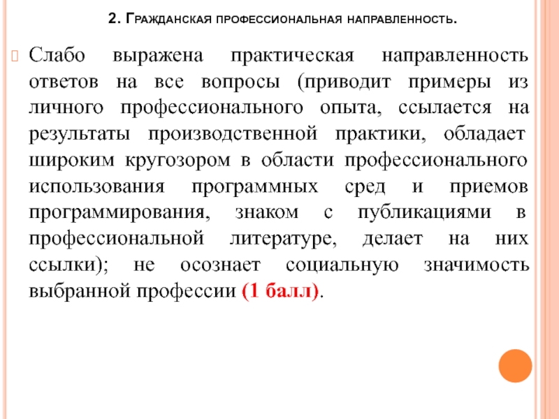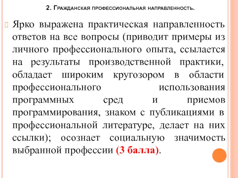 производственной практики, обладает широким кругозором в области профессионального использования программных сред и приемов программирования, знаком с публикациями в профессиональной литературе, делает на них ссылки); не осознает социальную значимость выбранной профессии (1 балл).