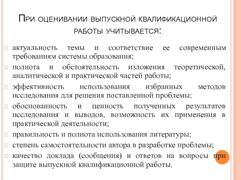 Слайд 3При оценивании выпускной квалификационной работы учитывается: