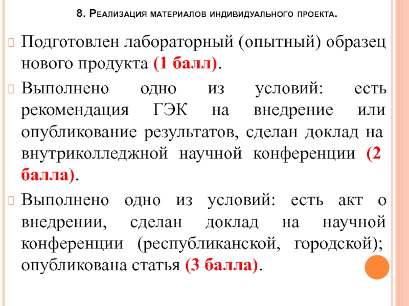 Выполнено одно из условий: есть акт о внедрении, сделан доклад на научной конференции (республиканской, городской); опубликована статья (3 балла).