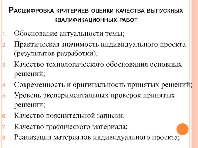 Слайд 11Расшифровка критериев оценки качества выпускных квалификационных работ