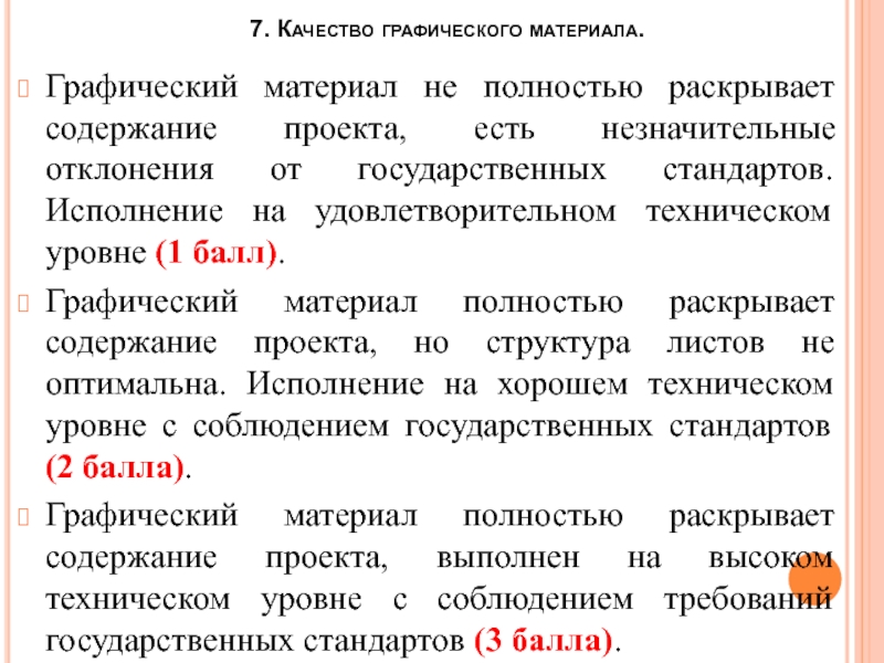 Графический материал полностью раскрывает содержание проекта, выполнен на высоком техническом уровне с соблюдением требований государственных стандартов (3 балла).
