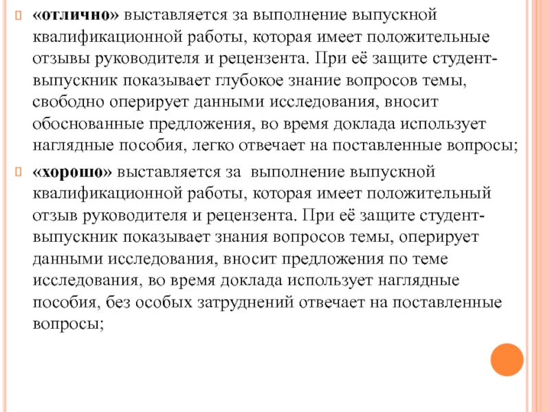 Слайд 5«отлично» выставляется за выполнение выпускной квалификационной работы, которая имеет положительные