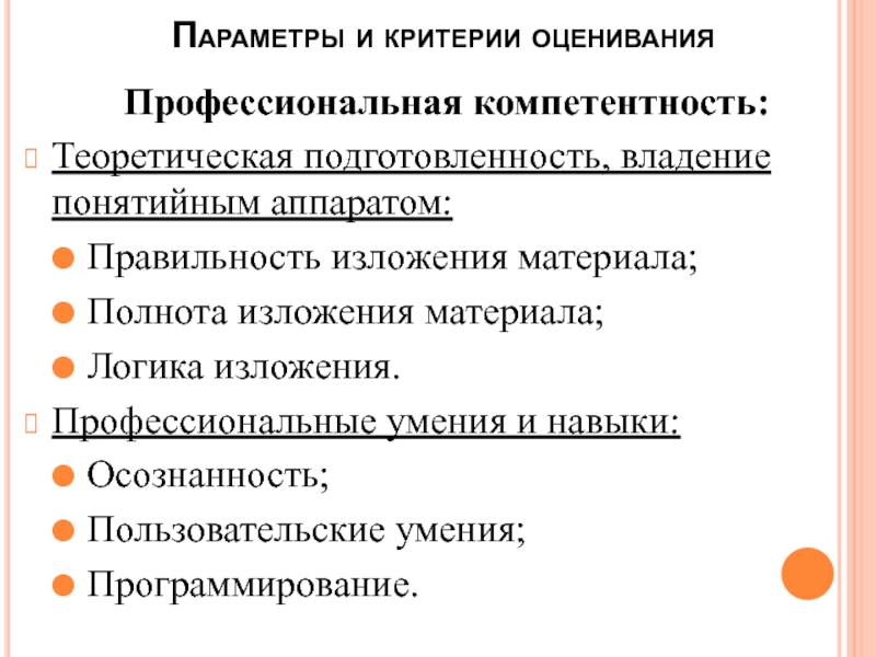 Правильность (не допускает терминологических ошибок: правильно использует термины, правильно их произносит, в речи отсутствуют просторечные выражения, слова-паразиты), точность, выразительность, эмоциональность (3 балла).