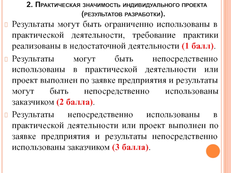 Результаты могут быть непосредственно использованы в практической деятельности или проект выполнен по заявке предприятия и результаты могут быть непосредственно использованы заказчиком (2 балла).