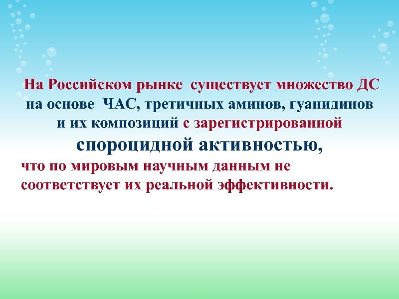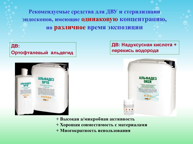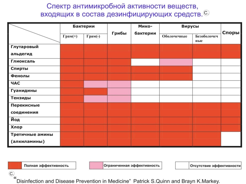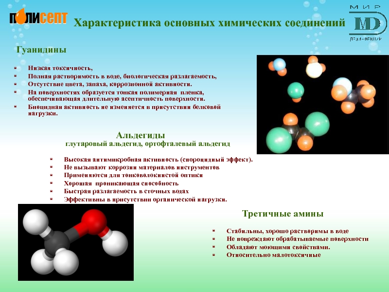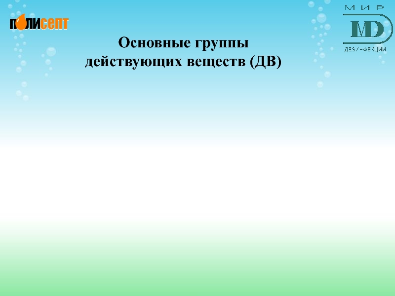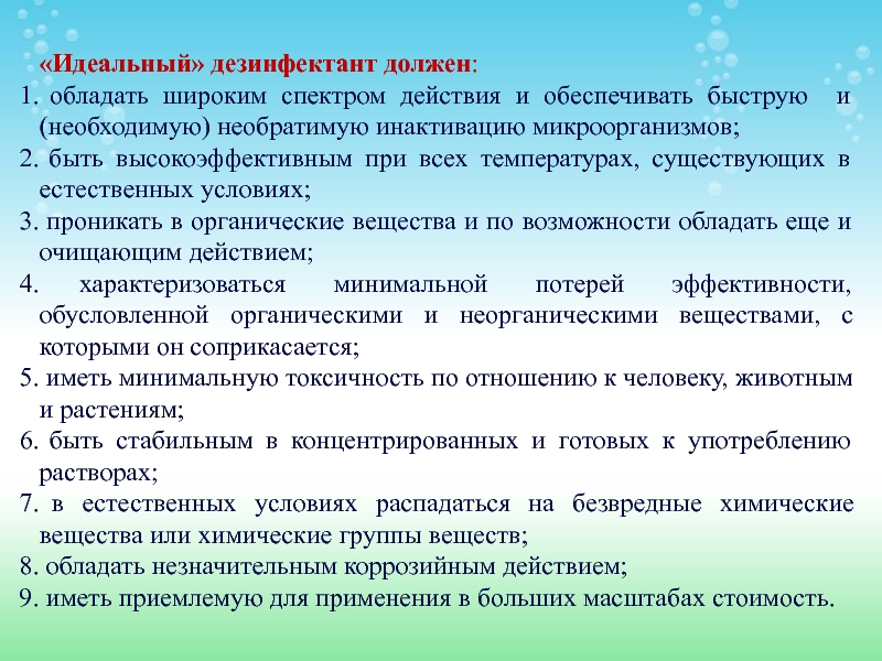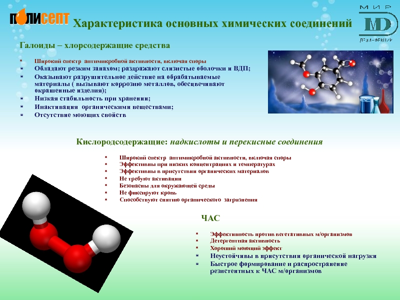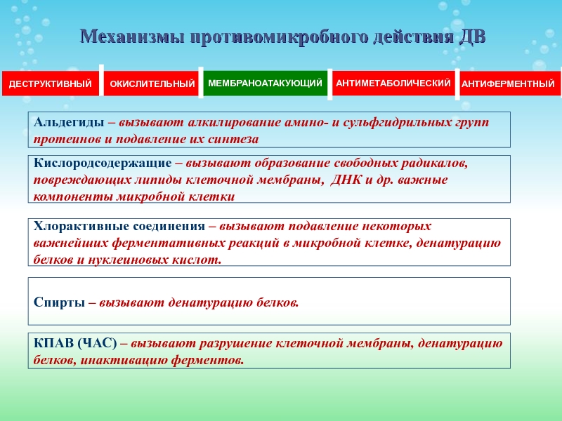 Хлорактивные соединения – вызывают подавление некоторых важнейших ферментативных реакций в микробной клетке, денатурацию белков и нуклеиновых кислот.